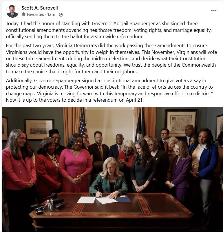 “Today is a historic day for Virginia. With Governor Abigail Spanberger’s signature, three constitutional amendments protecting healthcare freedom, voting rights, and marriage equality have completed the legislative process and are now headed to the ballot. Now, the final decision belongs to the people of the Commonwealth.