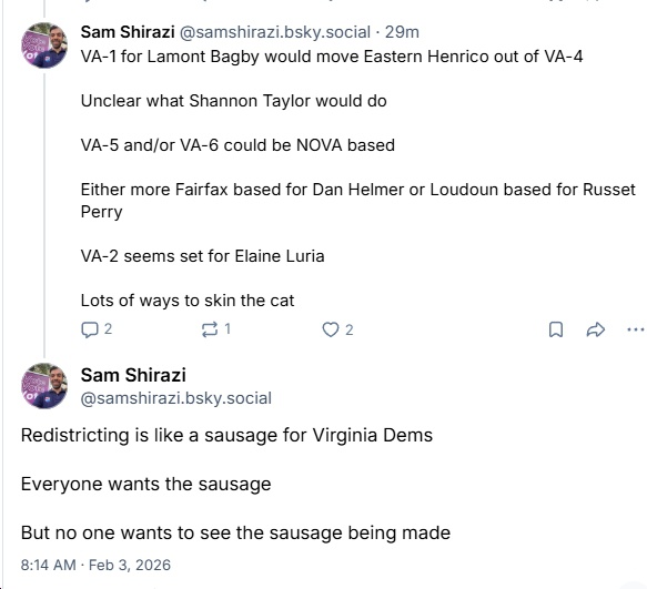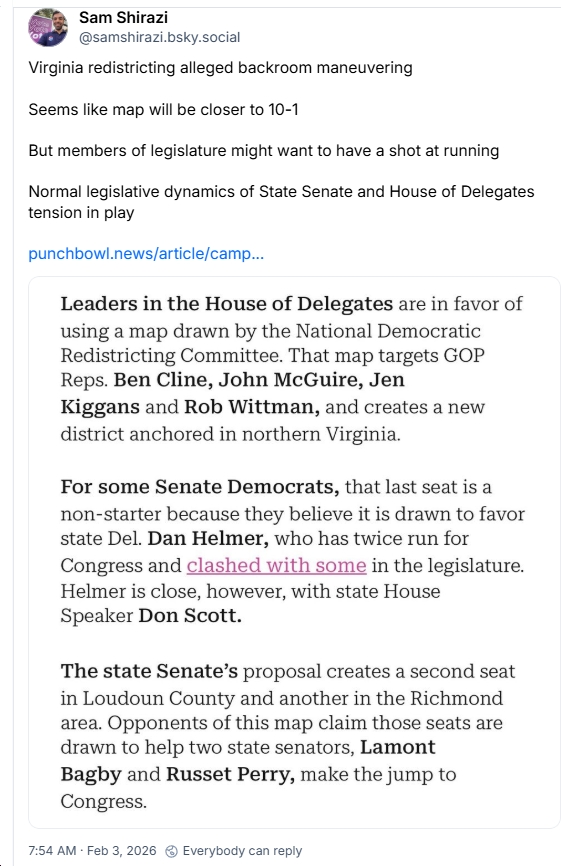 What’s going on with the Virginia redistricting maps we were promised by January 30? See Punchbowl and Virginia Scope for some details (note: I’ve heard a lot of this stuff – including rumors about Lamont Bagby, Dan Helmer and Russet Perry; about drawing together Tom Perriello and Shannon Taylor; etc. for days or even weeks, but I was told “on deep background”/”off the record,” so couldn’t use it…lol). A few key takeaways:
