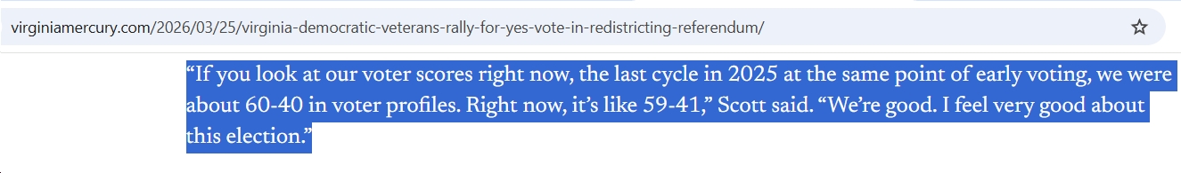 “If you look at our voter scores right now, the last cycle in 2025 at the same point of early voting, we were about 60-40 in voter profiles. Right now, it’s like 59-41,” Scott said. “We’re good. I feel very good about this election.”