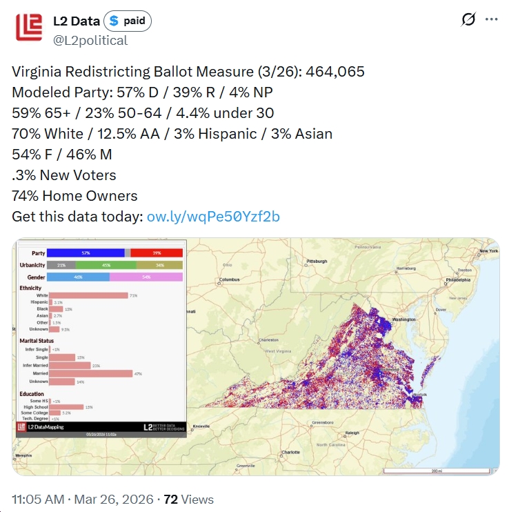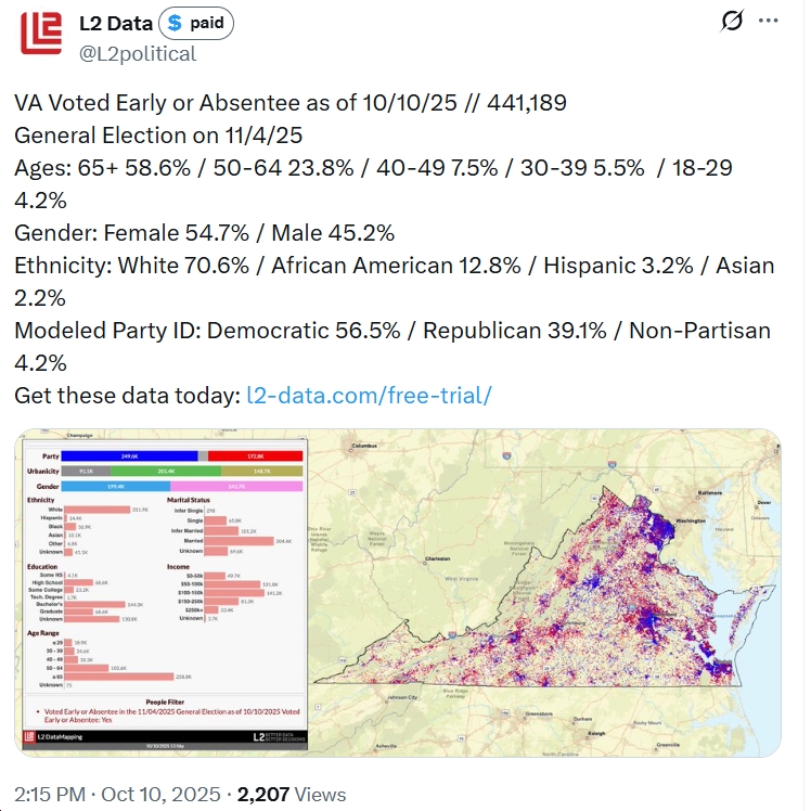 First, check out the new modeling estimate from L2 Political, and compare/contrast to L2’s estimate on 10/10/25, a few weeks before the 11/4/25 election, which Democrats won in a landslide (Spanberger by 15+ points; +13 Dems in the House of Delegates; etc.).
