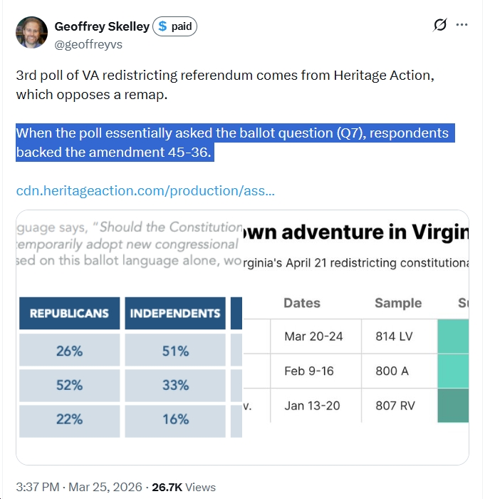 Now, for what it’s worth, check out the “poll” by the far-right Heritage Foundation (authors of the infamous “Project 2025”) yesterday. And yes, as Geoffrey Skelley explains, “When the poll essentially asked the ballot question…respondents backed the amendment 45-36.” So that’s YES +9 in a far-right “poll,” or whatever you want to call it…