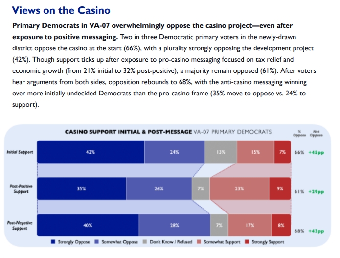 Finally, it’s interesting that this poll focused on likely VA07 Democratic primary voters; seems like an effort to push VA07 Democratic candidates to oppose the casino. We’ll see if it works.
