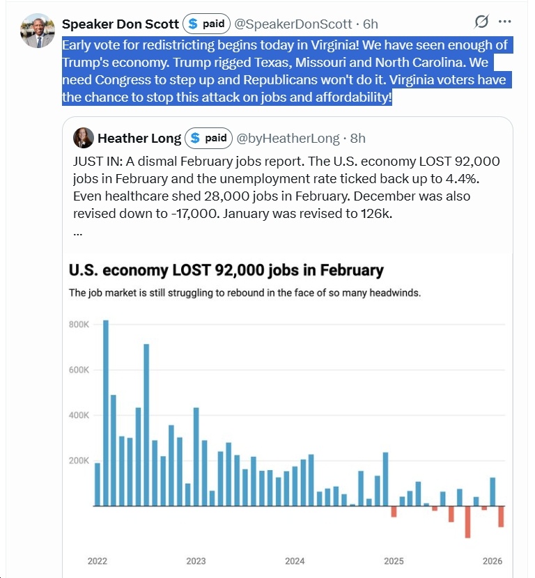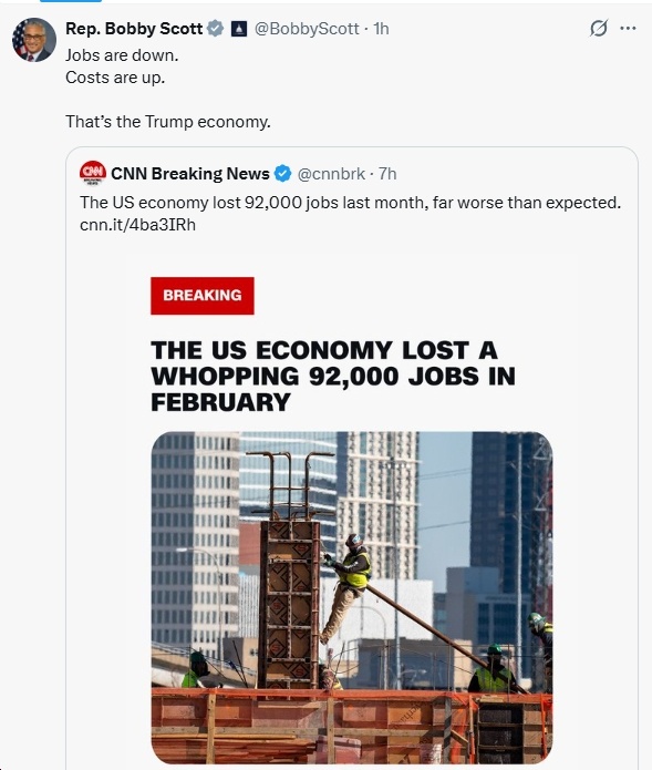 “92,000 jobs lost. Skyrocketing gas prices because of the administration’s war of choice. This is Trump’s economy.”