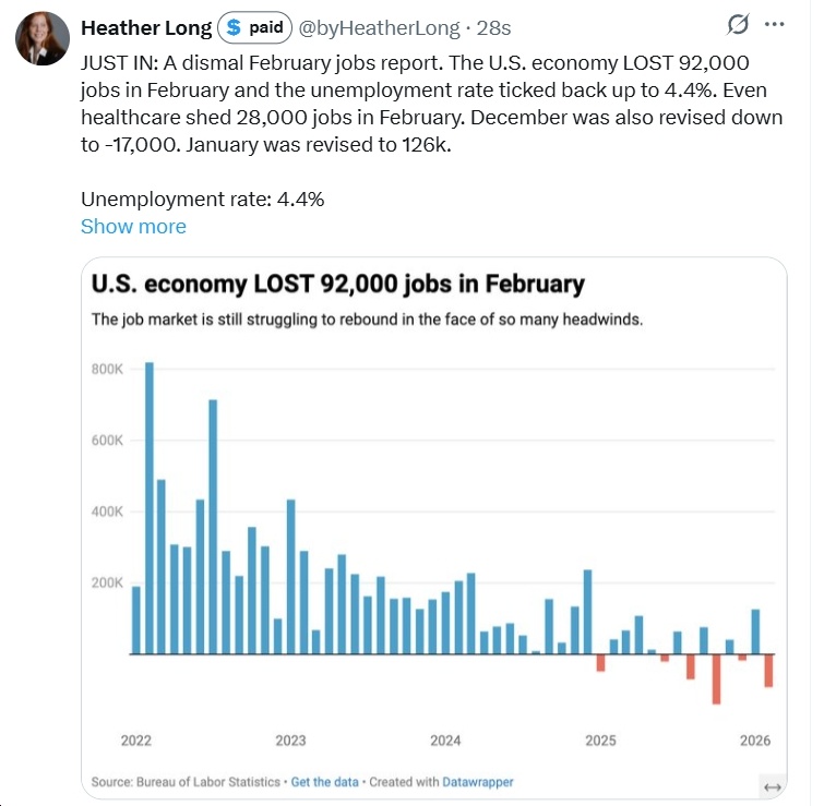 92,000 jobs lost. Skyrocketing gas prices because of the administration’s war of choice. This is Trump’s economy. pic.twitter.com/lOEYECeVgA