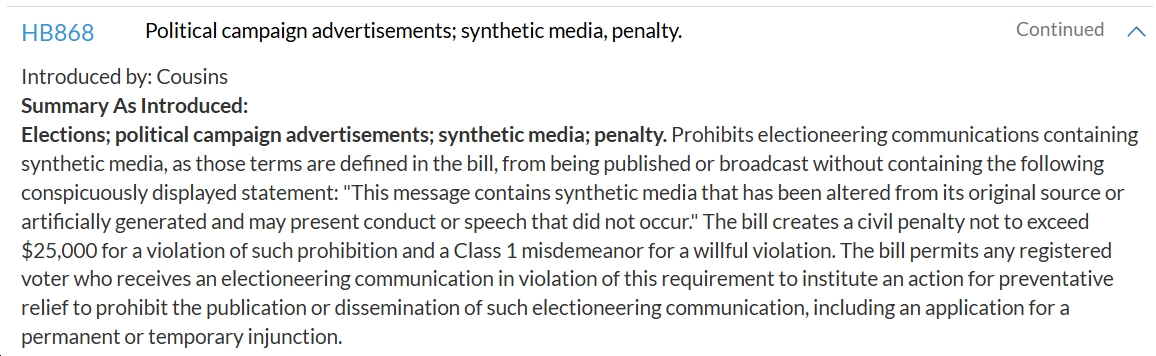 - Limiting other states’ National Guard presence in Virginia (SB337-Perry) and deployment of the Virginia National Guard at elections (HB286-Helmer)