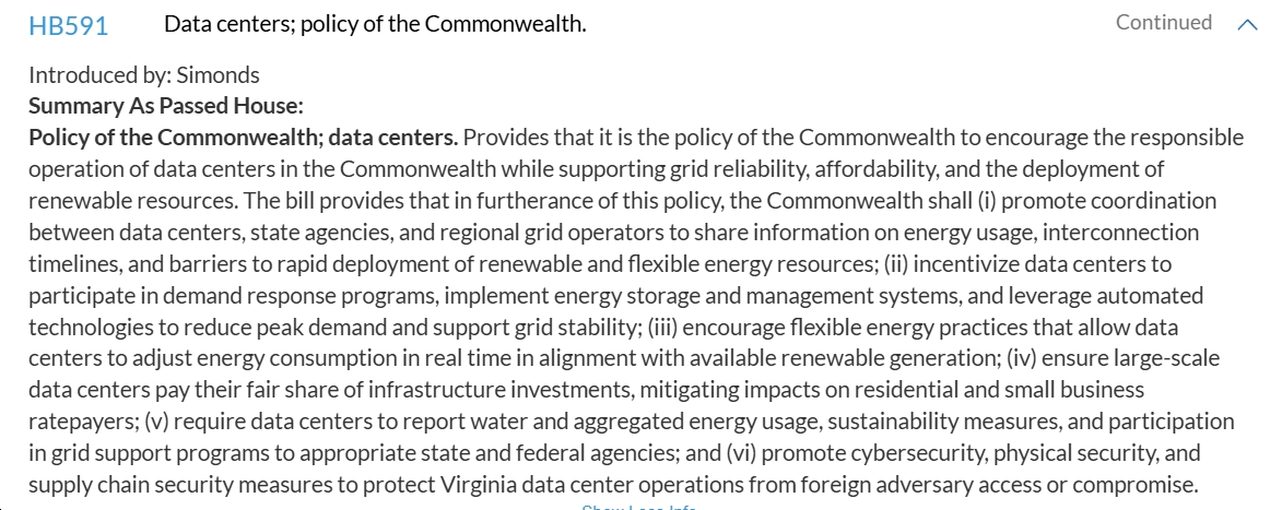 - Also disappointing, IMHO, was that Democrats really needed to strengthen the Virginia Clean Economy Act (VCEA) in a big way, given that we’re falling behind on the clean energy and climate goals set out in VCEA. As Ivy Main wrote this past week, Democrats certainly did some good stuff – for instance, they “passed integrated resource planning reform legislation that requires Dominion and Appalachian Power to present the SCC with plans that adhere more closely to the spirit of the VCEA”; they also took “tentative steps towards performance-based regulation, which would reward utilities for doing things like meeting clean energy and affordability goals rather than for just building more infrastructure.” So that’s good stuff, but definitely not sufficient – not even close, franky – to the challenges facing us (the climate crisis, which is only getting WORSE; the massive economic/health/security costs of our fossil fuel reliance) and the huge economic and affordability opportunities from moving to a clean energy economy. What we need instead, as Ivy Main correctly points out, is a far more aggressive timeline for decarbonizing Virginia’s economy, preferably by 2045 (or sooner, I’d argue, given the degree of urgency). Ideally, that would mean building a TON more solar power (both utility-scale and distributed/rooftop/etc.), and most importantly pushing for *massive* increases in energy efficiency (aka, the biggest bang for the buck, “negawatts” – the energy you never have to produce in the first place, etc.). And, of course, we also need to rein in the massive increases in power demand by voracious data centers. So where was all that stuff? Well, bills like this one by Sen. Kannan Srinivasan (“Permits the governing body of any locality to give consideration to the adverse impacts on the electric grid caused by high-energy users”) was “passed by indefinitely” (aka, killed). On the other hand, if you look at this list by Ivy Main, a bunch of bills did pass, and those will be helpful, but I’m still not particularly seeing the REALLY big, ambitious stuff needed to tackle this massive challenge.