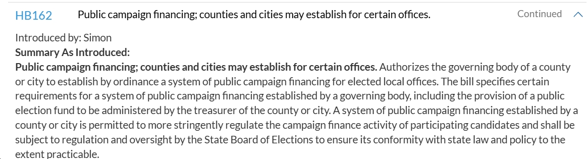 - I also agree with VAPLAN/Cindy on “missed opportunities,” particularly on campaign finance reform (yet again, Dominion and other corporate interests won out, while the rest of us lost; gotta love the “Virginia Way,” huh? not!), a new millionaires income tax bracket, etc.