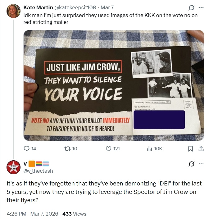 “As Virginia’s first Black Attorney General, I take very seriously the history that is being invoked in these mailers. Reports indicate that a group opposing the redistricting referendum has sent materials to Black voters that misuse imagery from the Civil Rights Movement and even invoke Jim Crow while falsely suggesting the measure threatens Black representation.