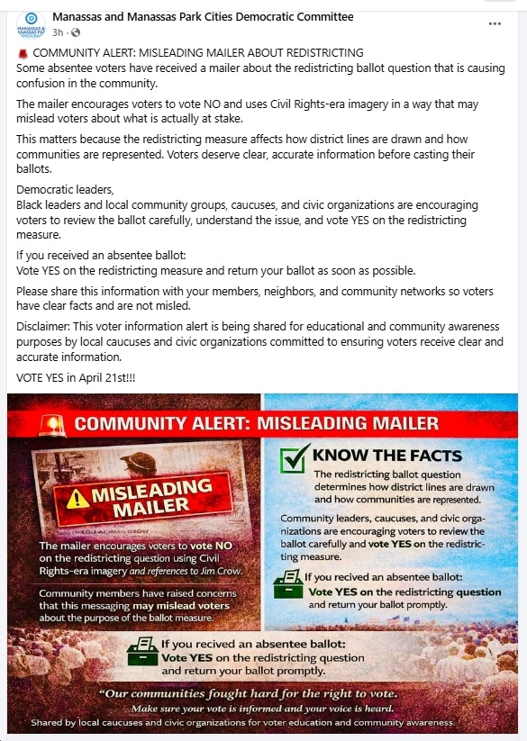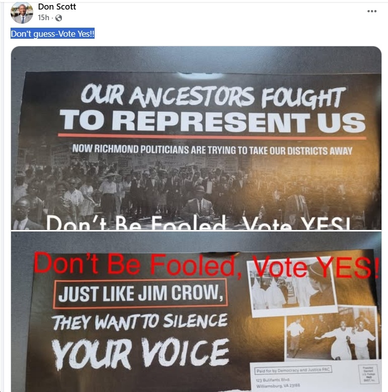 Virginians deserve honest information about the choices before them. Invoking the pain and sacrifice of the civil rights movement while spreading misleading claims about this referendum disrespects the very people who fought to secure the right to vote and have their voices heard.”