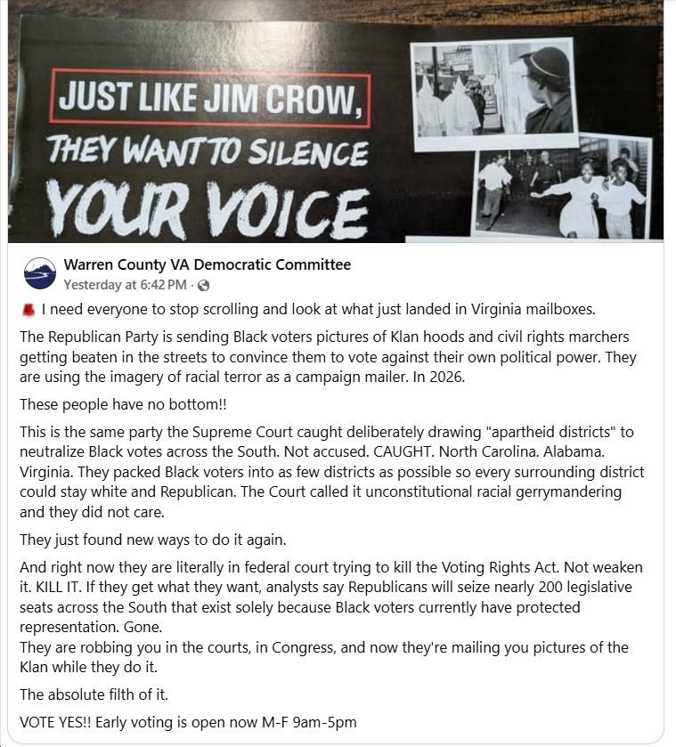 My parents and grandparents lived through the reality of Jim Crow in Virginia. They experienced firsthand what it meant when the law and the political system were used to silence Black voices. That history is not a political prop, and it should never be exploited in a misleading attempt to confuse voters.