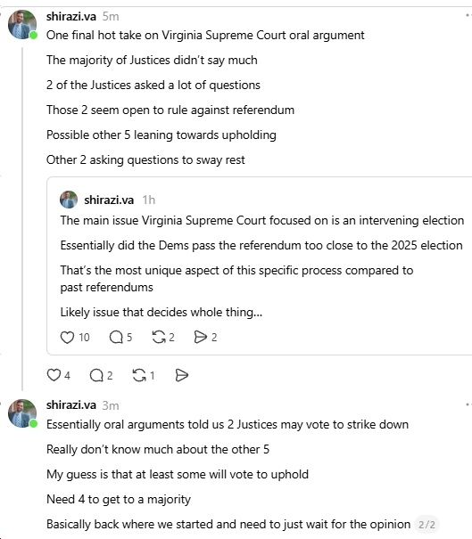 • Per Sam Shirazi: “The main issue Virginia Supreme Court focused on is an intervening election Essentially did the Dems pass the referendum too close to the 2025 election That’s the most unique aspect of this specific process compared to past referendums Likely issue that decides whole thing. Won’t be posting more about this But basically what we expected Court is grappling with the issue Some Justices are skeptical with lots of questions But other Justices not asking questions include Chief Suggests divided Court”