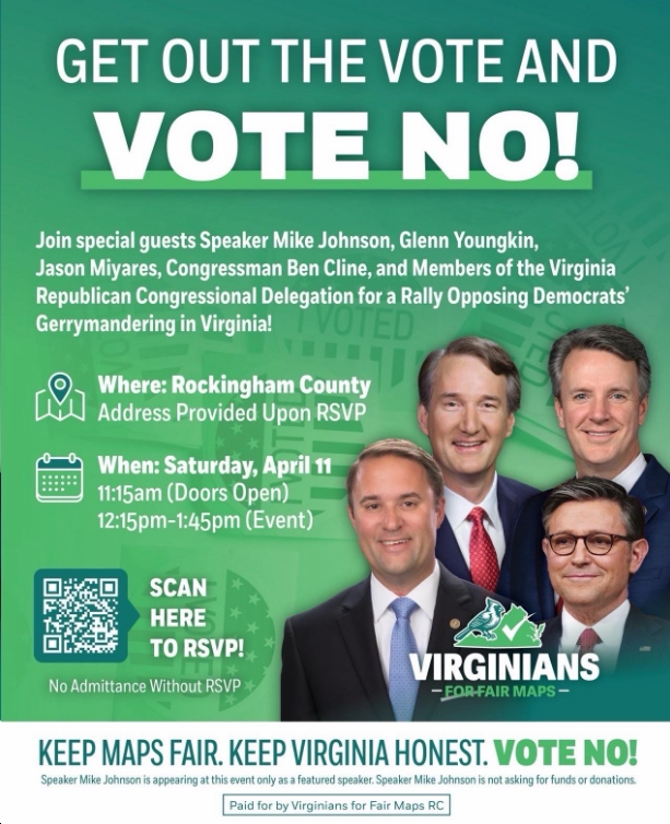 P.S. In addition to the fundraiser, MAGA fanatic/Trump puppet/pathological liar Mike Johnson is also one of the “special guests” (and by “special,” what they really mean is “especially HORRIBLE!” at a “VOTE NO!” rally – with Glenn Trumpkin/Youngkin, Jason Miyares, Ben Cline, etc.)