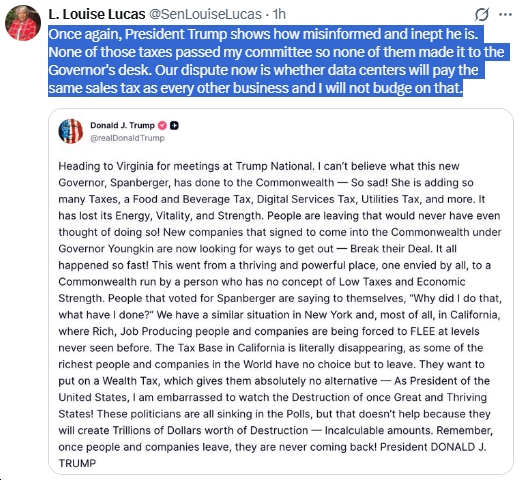So for the record, Spanberger so far has added ZERO taxes, with no tax increases on food, beverages, digital services, utilities, etc. even coming to her desk. Also, of course, Virginia hasn’t “lost its Energy, Vitality, and Strength,” nor has Virginia gone “from a thriving and powerful place, once envied by all, to a Commonwealth run by a person who has no concept of Low Taxes and Economic Strength.” Just total nonsense, drivel…and random Capital Letters for Absolutely No Reason, lol. Here’s how VA Senate President Pro Tempore Louise Lucas put it about our “misinformed and inept” president: