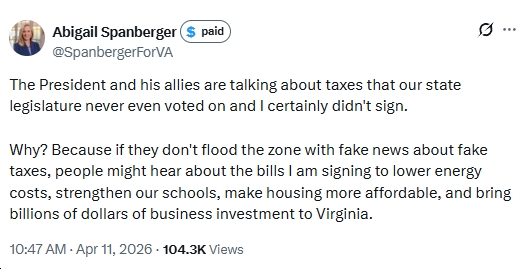 “The President and his allies are talking about taxes that our state legislature never even voted on and I certainly didn’t sign. Why? Because if they don’t flood the zone with fake news about fake taxes, people might hear about the bills I am signing to lower energy costs, strengthen our schools, make housing more affordable, and bring billions of dollars of business investment to Virginia.”