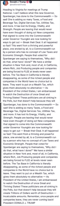 “Heading to Virginia for meetings at Trump National. I can’t believe what this new Governor, Spanberger, has done to the Commonwealth — So sad! She is adding so many Taxes, a Food and Beverage Tax, Digital Services Tax, Utilities Tax, and more. It has lost its Energy, Vitality, and Strength. People are leaving that would never have even thought of doing so! New companies that signed to come into the Commonwealth under Governor Youngkin are now looking for ways to get out — Break their Deal. It all happened so fast! This went from a thriving and powerful place, one envied by all, to a Commonwealth run by a person who has no concept of Low Taxes and Economic Strength. People that voted for Spanberger are saying to themselves, “Why did I do that, what have I done?”…