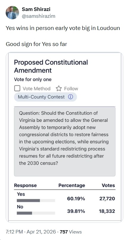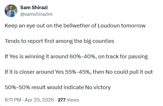 UPDATE 7:23 pm: With 434 of 2,534 precincts reporting it’s now YES 281,243 (52.72%) vs NO 252,58 (47.28%). Sam Shirazi says “Loudoun is over 90% including all of early vote and mail; Above the 60-40 margin needed for a comfortable Yes win; Will take a while for an official call; But this looks like a redo of the 2025 AG race; Shy Yes voters were a thing”