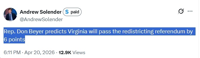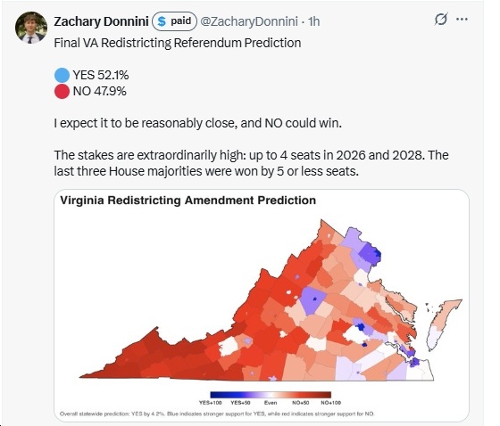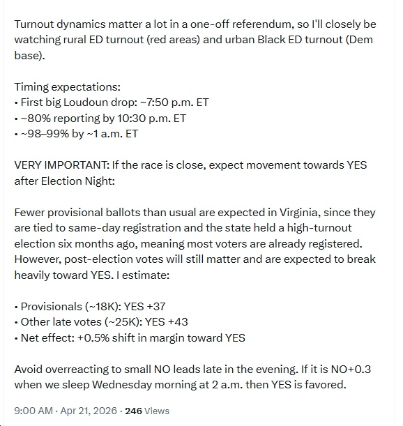 1) Statewide turnout in November 2025 was over 3.4 million, with about 1.5 million votes being cast early in that election. In this election, the early vote was at 1.36 million after Saturday voting, so closing in on the 2025 early vote total. According to State Navigate’s model, the early vote is at about 59.1% Democratic vs. 40.9% Republican; and according to L2 Political, it’s about 54.7% Democratic vs. 39.7% Republican. Now, we need to see how turnout looks on election day itself. Obviously, if turnout is heavy in “Trumpy” areas in SW Virginia and light in the “blue” areas (e.g., NoVA, Hampton Roads, the Richmond area), etc., that’s not a great sign for the YES campaign; conversely, if turnout is “meh” in the red areas and strong in the blue areas on election day, YES could/should win comfortably. Something to keep an eye on.