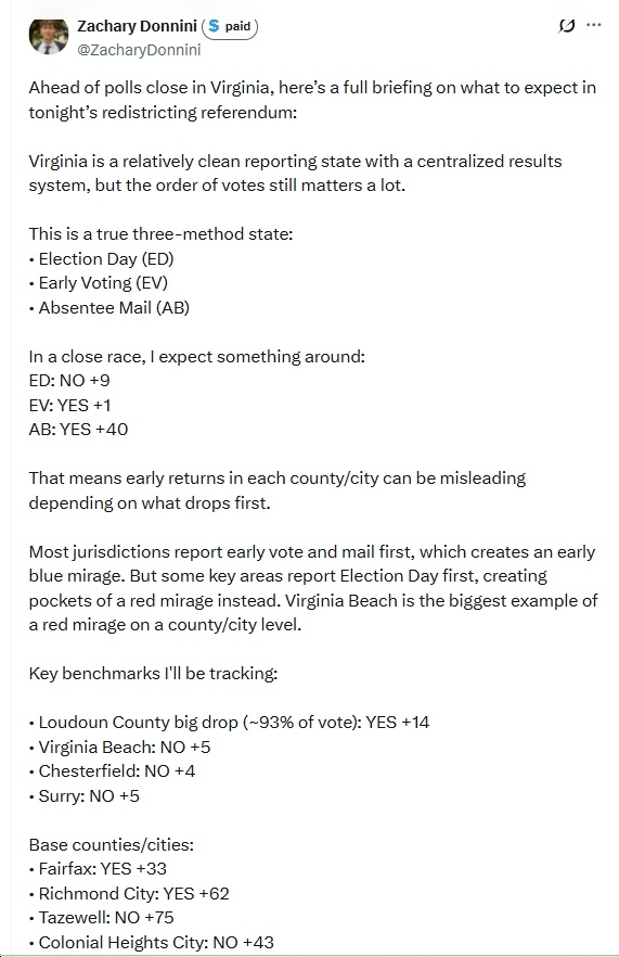UPDATE 7:54 pm: Per Zachary Donnini, “Well, we got a pretty good hint about how Black voters in urban areas will break. Norfolk City EV is better for YES than it was for Jay Jones in 2025. I am thinking YES by 5-6% right now.”