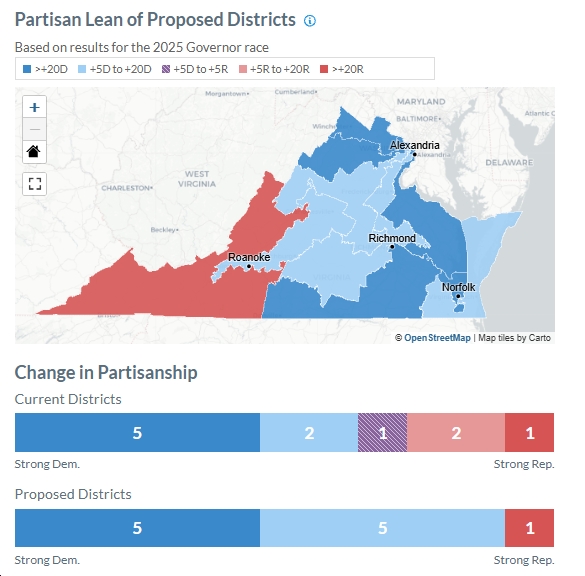 - [UPDATED with Map] Report by Brandon Jarvis: VA “General Assembly Democrats have reached agreement on a 10-1 map”; “Sen. Lucas says the maps are competitive”