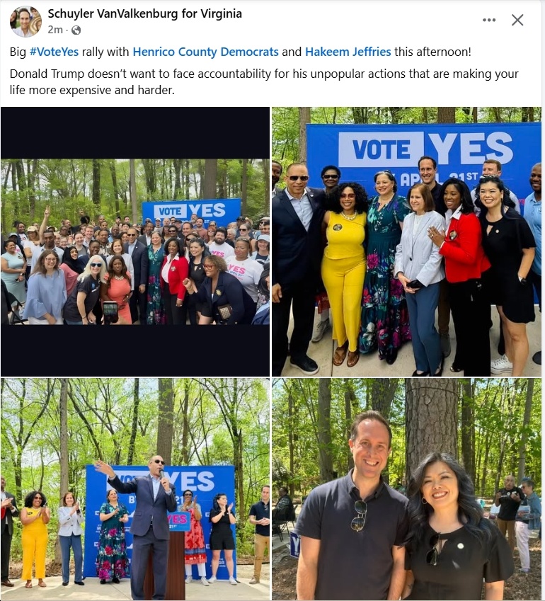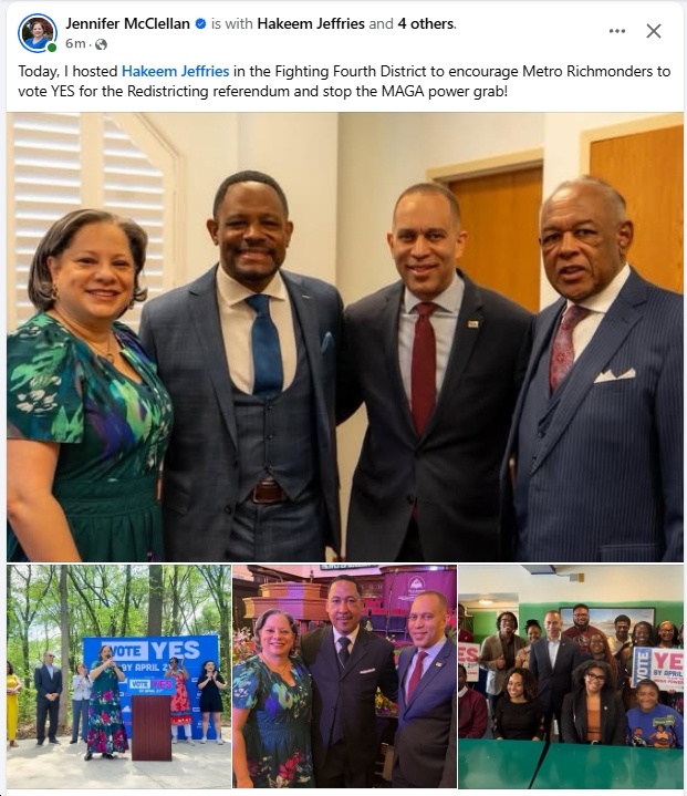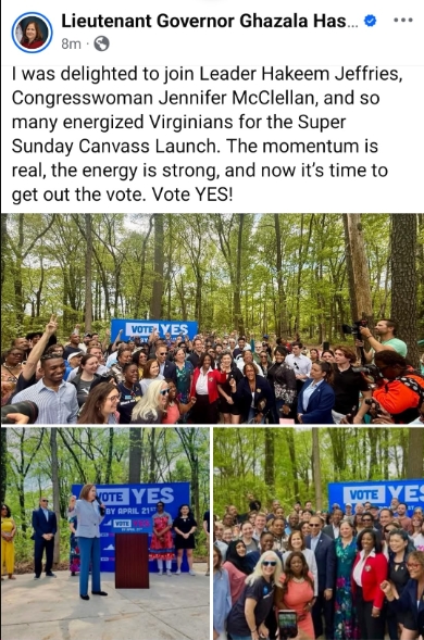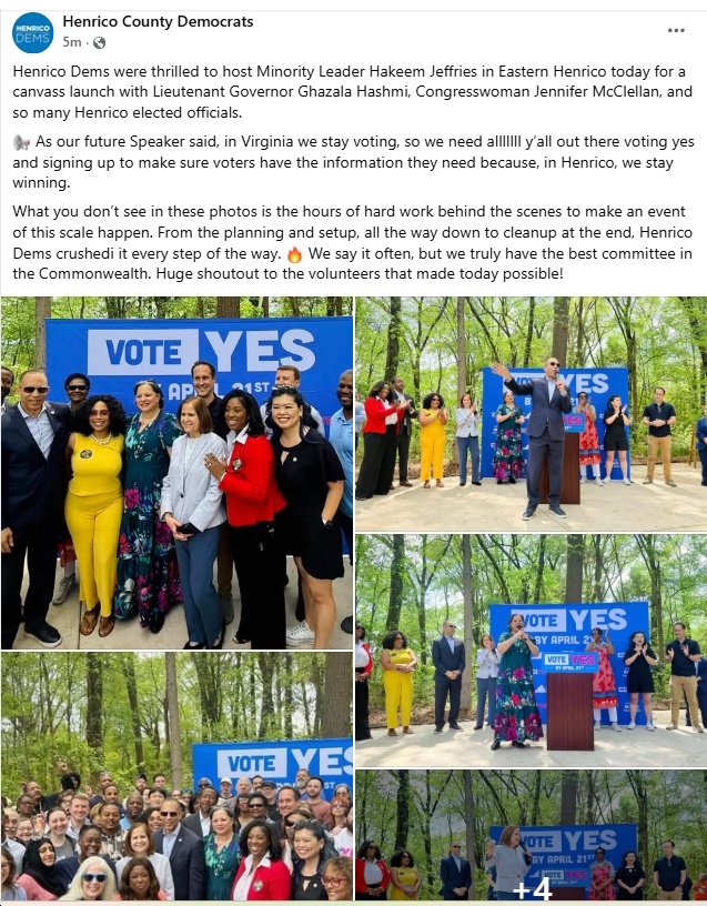 Among the leaders helping drive the effort were U.S. House Minority Leader Hakeem Jeffries, Former U.S. Attorney General Eric Holder, Lieutenant Governor Ghazala Hashmi, U.S. Senator Mark Warner, and U.S. Representatives Don Beyer, Eugene Vindman, Bobby Scott, Jennifer McClellan, Suhas Subramanyam and James Walkinshaw.