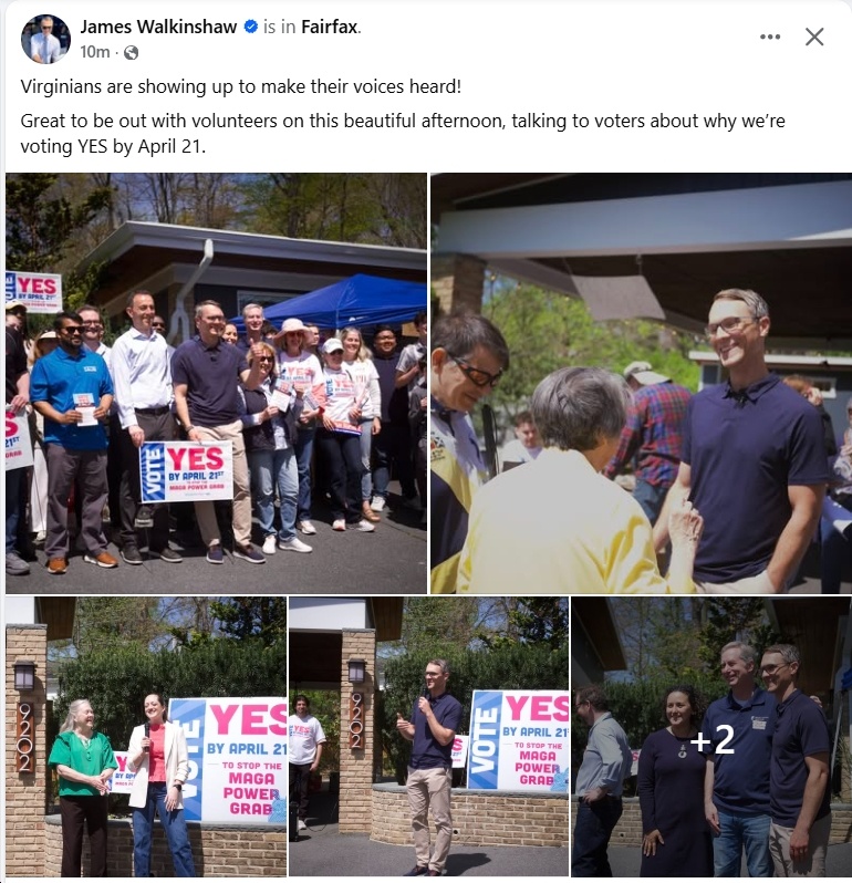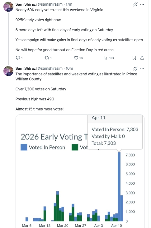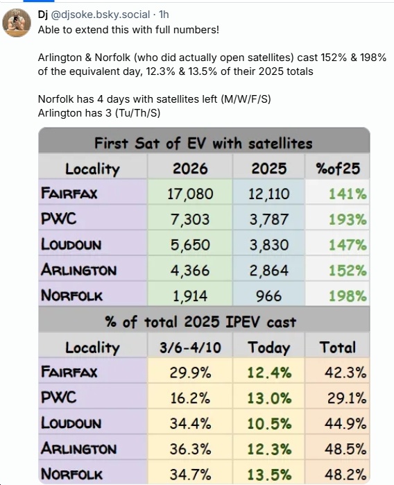 This past weekend was the start of Saturday voting, massively expanded satellite early voting, etc. – and the results were clear: huge turnout in deep-blue areas like Prince William County, Fairfax County, Henrico County, Norfolk, etc, etc. To see the statistics, check out VPAP (which has total early voting so far at 924,230, slightly below the same point in October 2025 (977,605), which of course was for an election for Governor/Lt. Governor/Attorney General/House of Delegates. Also, see below for some analysis, photos, etc. For instance, Virginia political analyst Sam Shirazi says: