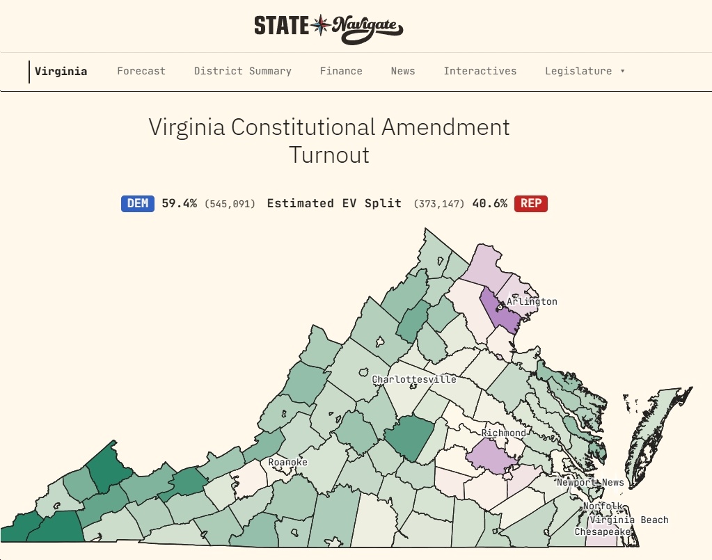 - “Nearly 69K early votes cast this weekend in Virginia; 925K early votes right now; 6 more days left with final day of early voting on Saturday. Yes campaign will make gains in final days of early voting as satellites open; No [campaign] will hope for good turnout on Election Day in red areas”