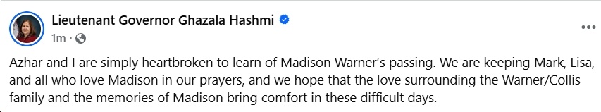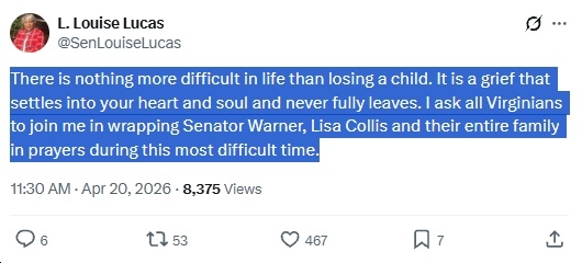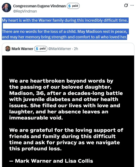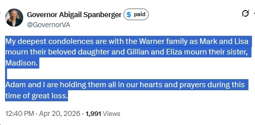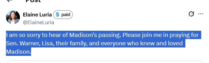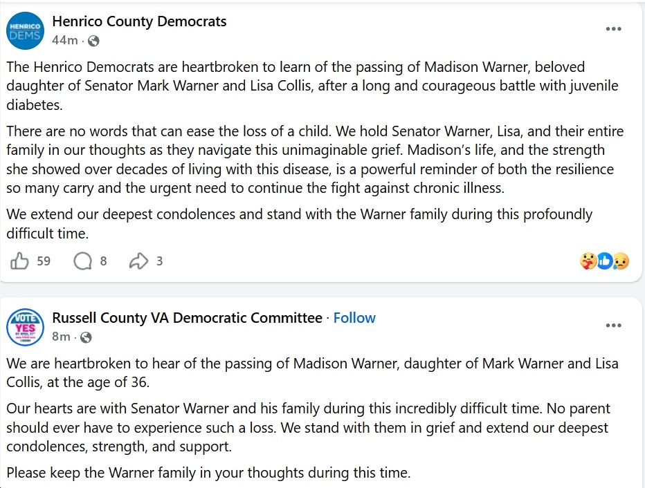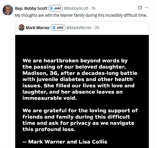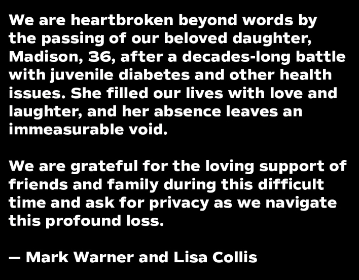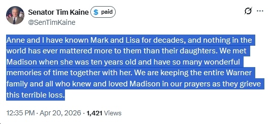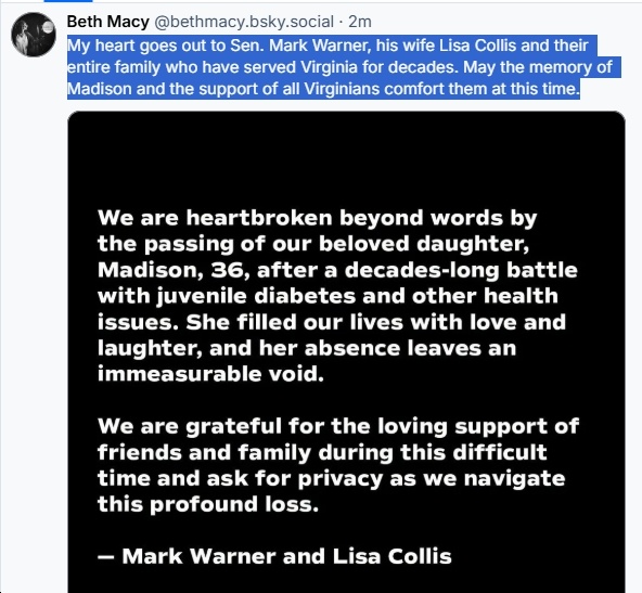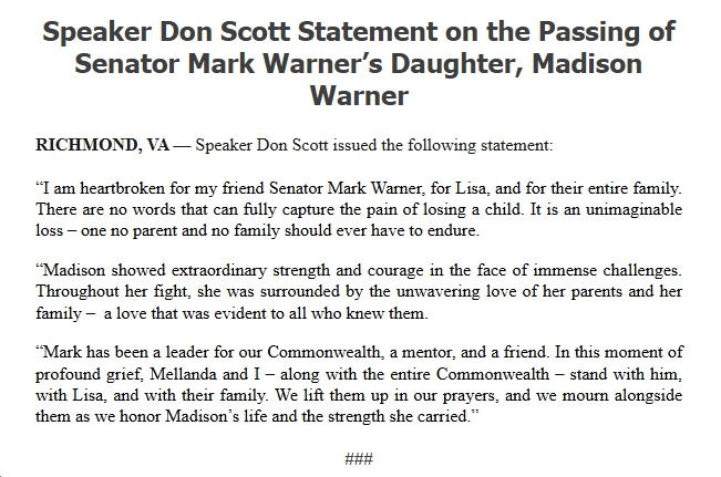 Ugh, this is so sad! Deepest condolences to Sen. Mark Warner and his wife, Lisa Collis, on the loss of their daughter, Madison. May her memory be a blessing to her family and friends. I’ll include other reactions in this post, as I see them…