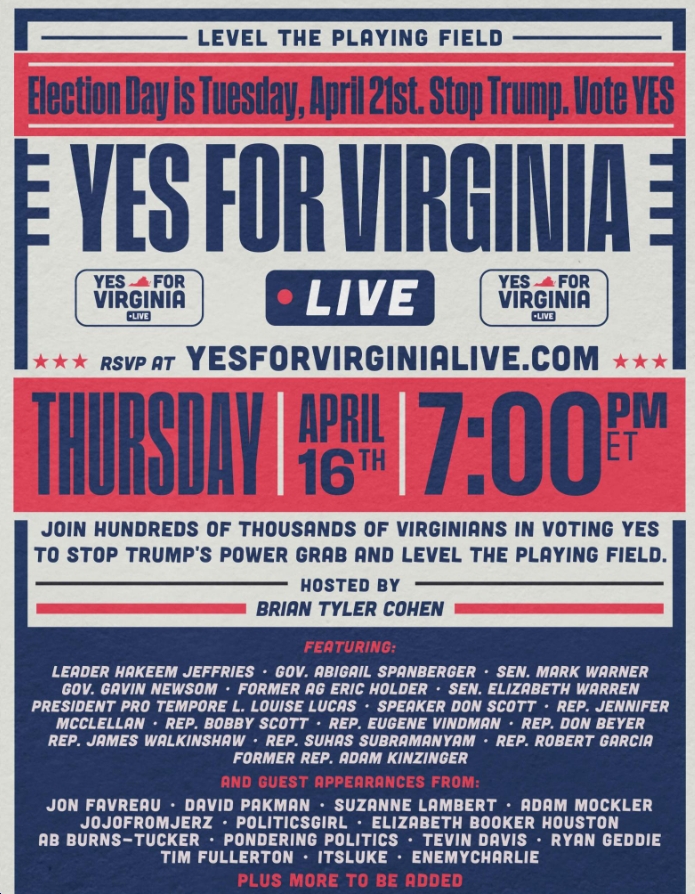 - Bryan Tyler Cohen kicks it off, says we need to keep momentum going and remind everyone to vote YES tomorrow, Saturday or Tuesday. Go to IWillVote.com/va to find your polling place.