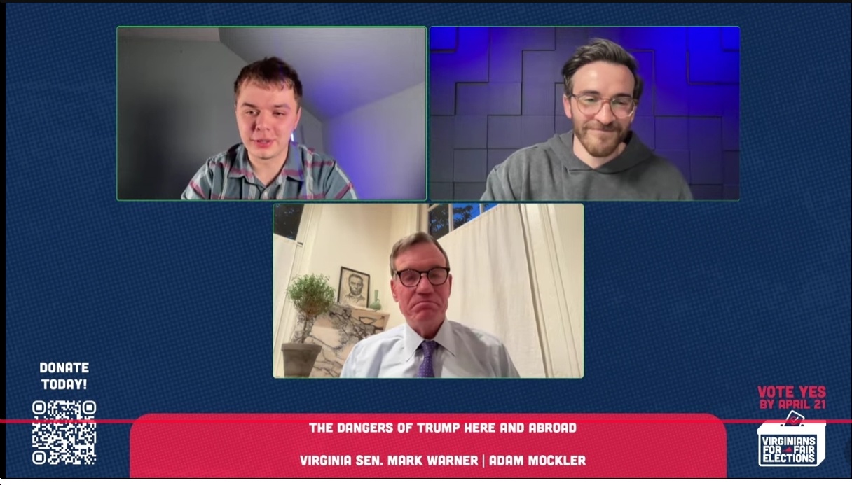- Sen. Mark Warner says we have an administration that’s “gone totally rogue” and “Americans are paying the price.” In 2022, Donald Trump stole three seats in NC, without much attention, and could have made Hakeem Jeffries the Speaker (plus avoided the Big Ugly Bill passing). Democrats have always supported nonpartisan redistricting, but not when Republicans cheat – we’re changing the rules because Republicans cheated. Says he’s given up on Republicans until they come back to sanity and a legitimate Republican Party, pretty much, and that for now we just need to focus on “kick[ing] their ass.”