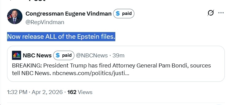 “Attorney General Bondi’s firing follows her botched handling of the Epstein files — a failure that denied victims transparency and further undermined trust in our justice system.