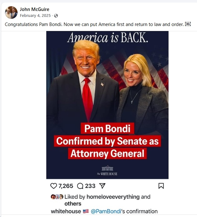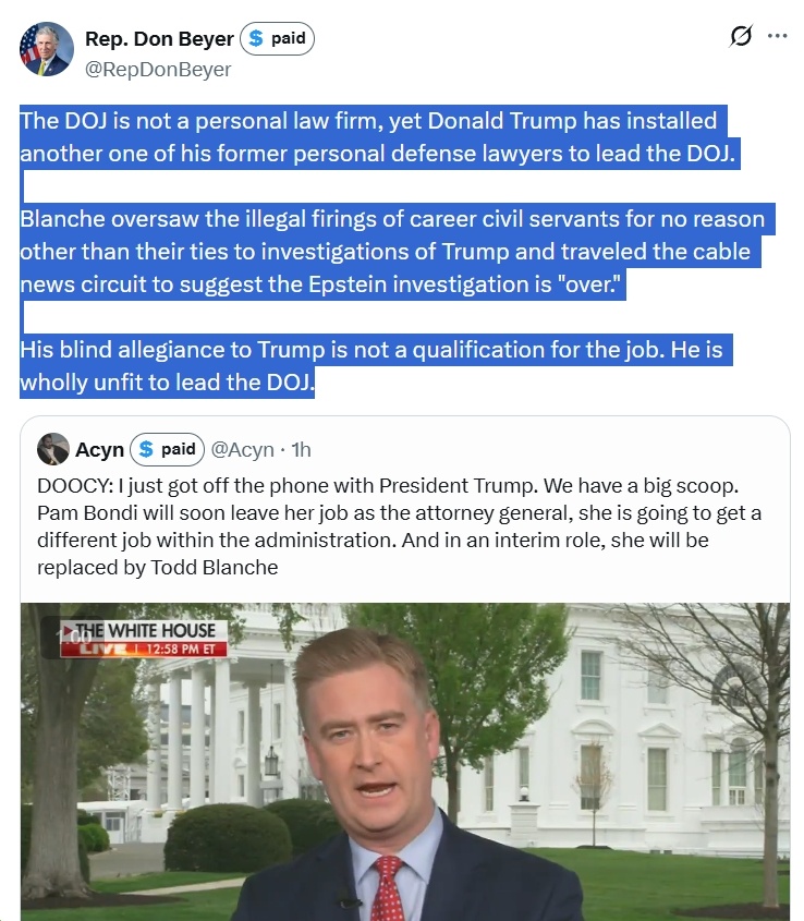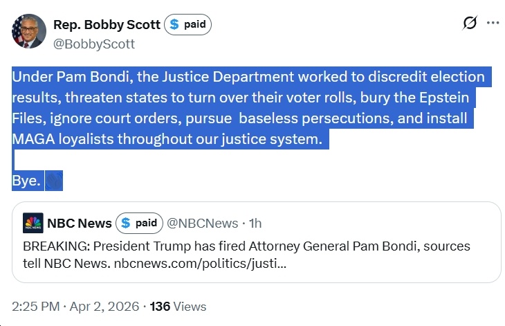 Good riddance to Pam Bondi as Attorney General; she was absolutely HORRIBLE, quite possibly the worst Attorney General in U.S. history. So that’s the good news; the bad news is that Trump’s replacement for her won’t likely be any better. Anyway, with that, see below for reactions from Virginia elected officials to Pam Bondi’s firing by her even-worse-scumbag boss.