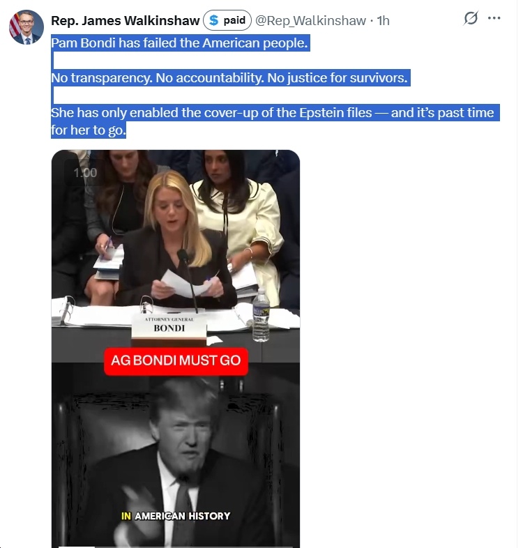 “Pam Bondi may go down as one of the worst AGs in history. She openly violated the law repeatedly and aided one of the most corrupt administrations in modern history. She spent most of her time trying to weaponize the agency against anyone the President didn’t like, and she fired countless career prosecutors for simply following the law and upholding the Constitution. I had called for her impeachment, but this works too.
