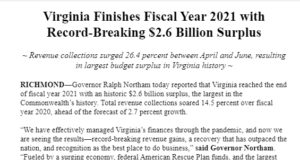Virginia Finishes Fiscal Year 2021 with Record-Breaking $2.6 Billion Surplus