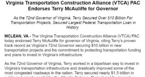Virginia Transportation Construction Alliance (VTCA) PAC Endorses Terry McAuliffe for Governor