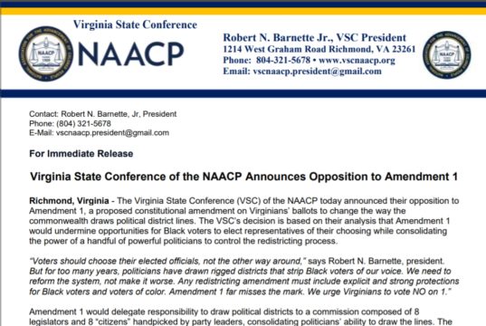 Virginia State Conference of the NAACP Announces Opposition to Amendment 1