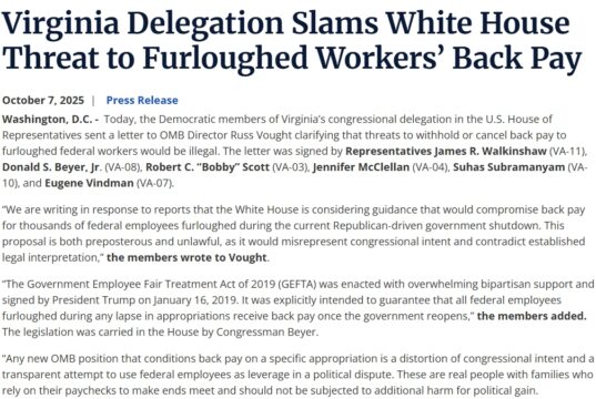Virginia Delegation Democrats Slam White House Threat to Furloughed Workers’ Back Pay