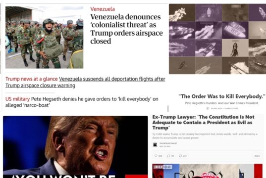 Sunday News: “Venezuela denounces ‘colonialist threat’ as Trump orders airspace closed”; “Hegseth’s murders. And our War Crimes President”; “We...