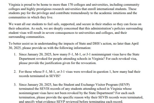 Senators Kaine, Warner Demand Answers from Departments of State, Homeland Security on Sudden and Unexplained Revocations of Virginia Students’...