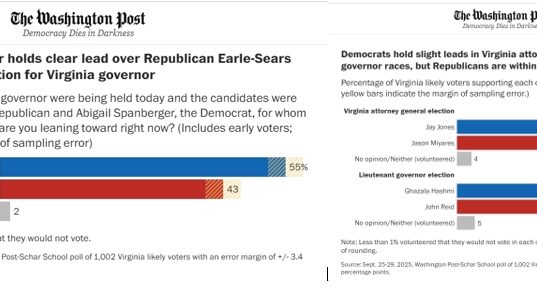WaPo/Schar Poll: Spanberger 55%-Earle-Sears 43%; Hashmi 49%-Reid 45%; Jones 51%-Miyares 45%