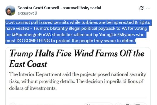 [UPDATED] After Dept. of Interior Puts Hold on Five East Coast Offshore Wind Farms, Including Coastal Virginia Offshore Wind,...