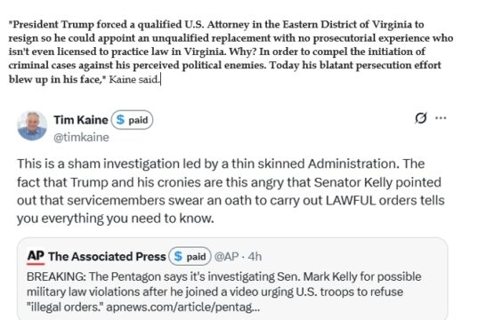 Sen. Tim Kaine Rips Trump Administration’s “Sham Investigation” Into Sen. Mark Kelly; On Comey Case Dismissal, Says Trump’s “blatant...