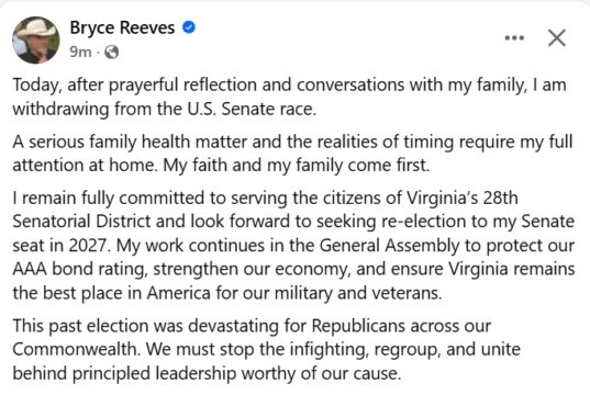 Sen. Mark Warner’s Leading Potential 2026 Republican Challenger, State Sen. Bryce Reeves, Announces He’s “withdrawing from the U.S. Senate...