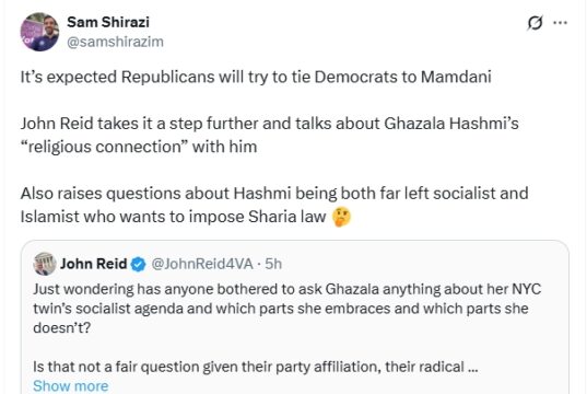 Sam Shirazi: “John Reid takes it a step further and talks about Ghazala Hashmi’s [Muslim] ‘religious connection’ with [Zohran...
