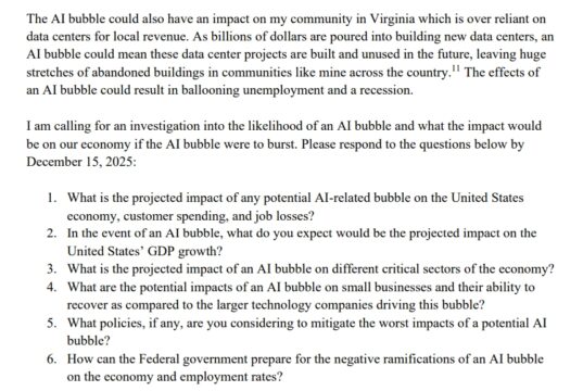 Rep. Suhas Subramanyam (D-VA10) Calls for “investigation into the likelihood of an AI bubble and what the impact would...