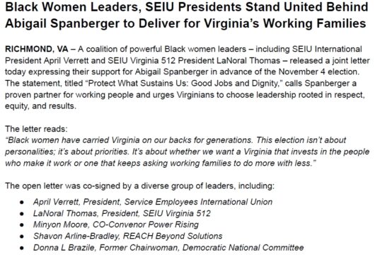 Coalition of Powerful Black Women Leaders, SEIU Presidents Stands United Behind Abigail Spanberger to Deliver for Virginia’s Working Families