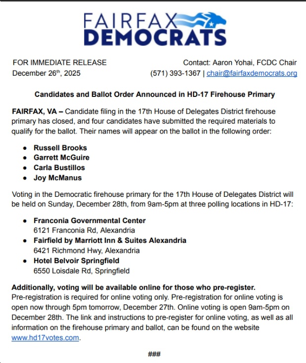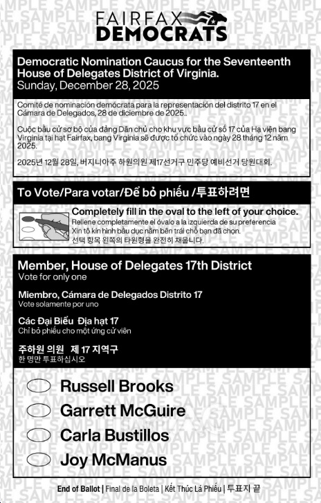 This past Wednesday, Fairfax City Democrats Chair Laura Stokes sent a questionnaire to candidates for the Democratic nomination in HD17 (Franconia-Springfield area of Fairfax County; deep-blue seat) to replace Del. Mark Sickles, who in a few weeks will be moving into the Abigail Spanberger administration as Secretary of Finance. For more on the HD17 Democratic candidates (Russell Brooks, Carla Bustillos, Garrett McGuire, Joy McManus) and who’s supporting them, see here. As for the questionnaire, Stokes asked that candidates get their answers back “by Saturday December 27 at 10 am,” and said they’d be posted on Blue Virginia with a headshot of each candidate. So with that, given the limited time until the firehouse primary TOMORROW starting at 9 am, I’m going to post these as they’re received. Thanks to the candidates for doing this!
