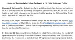 Del. Lee Carter and Paul Goldman Call on Fellow Candidates to...