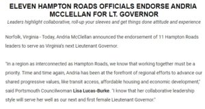 Eleven Hampton Roads Officials Endorse Andria McClellan for Lt. Governor