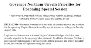 Governor Northam Unveils Priorities for Upcoming Special Session