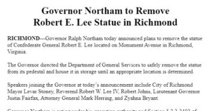 Press Release: Governor Northam to Remove Robert E. Lee Statue in Richmond